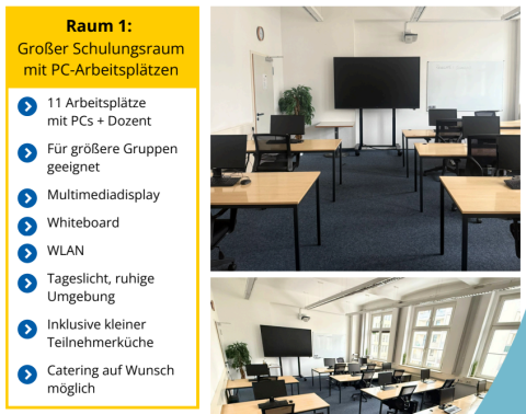 - Kapazität: 11 voll ausgestattete PC-Arbeitsplätze plus ein separater Dozentenplatz.